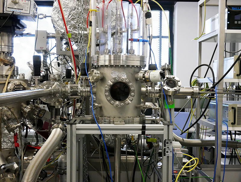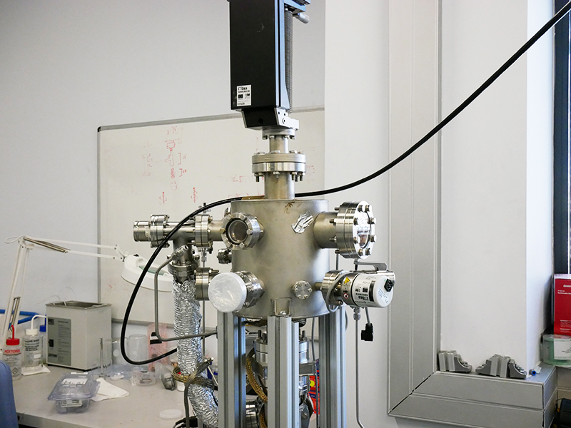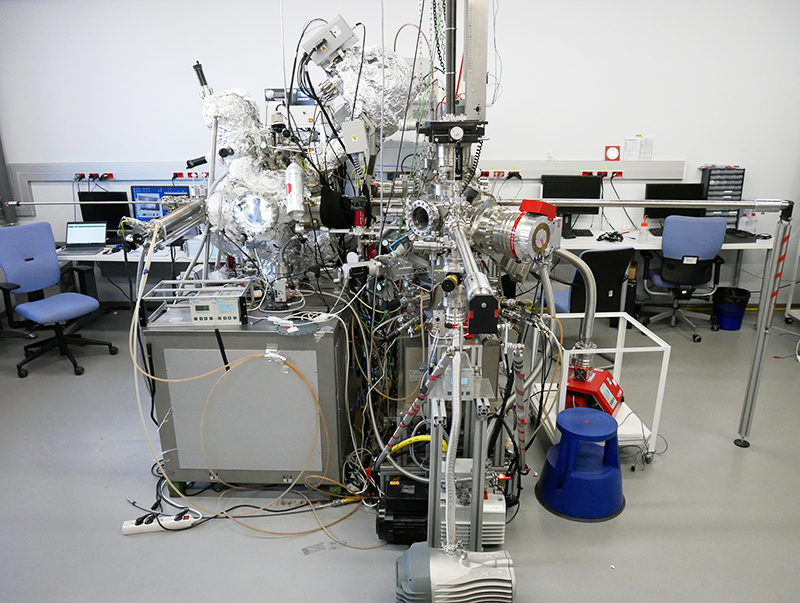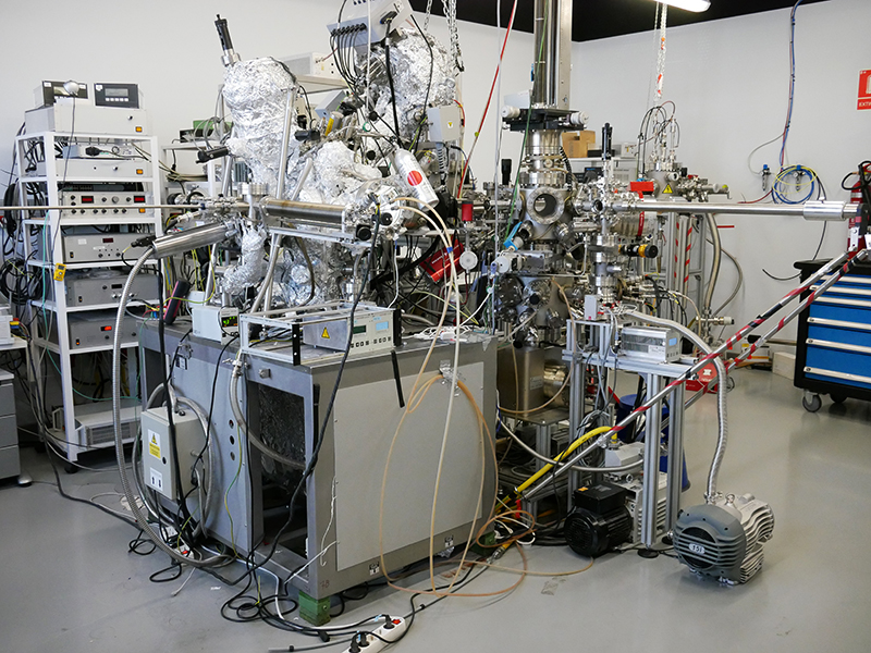Para ello disponemos de un sistema de fotoemision (XPS-UPS) en ultra alto vacío (UHV) para caracterización superficial, combinado con un sistema de espectroscopía de desorción térmica (TDS). Además de la caracterización superficial se puede estudiar la reactividad química de la superficie frente a la exposición a diferentes gases, así como depositar sobre la superficie recubrimientos metálicos (películas ultradelgadas de hasta 5 nm) mediante técnicas de crecimiento epitaxial (disponemos de evaporadores de bombardeo electrónico y celdas Knudssen).