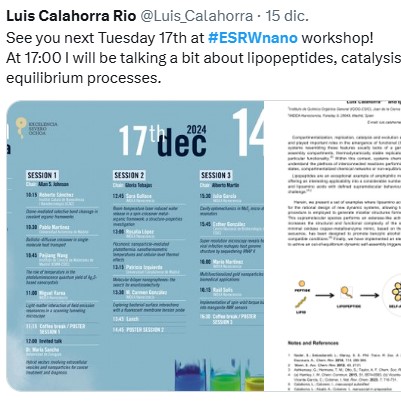 The #ESRWnano Social Media Scientific Session is an online event held over the internet with the purpose of encouraging the participants of 14th Early Stage Researchers Workshop in the communication of their results using social media platforms, expanding their network and fostering creativity. The event will be held on the 17th December 2024 from 9:00 to 15:00 h. How to participate - Share a post of your research on the 17th December. The format is free. Examples: animated posters, reels, TikTok video, photography with your poster, etc.