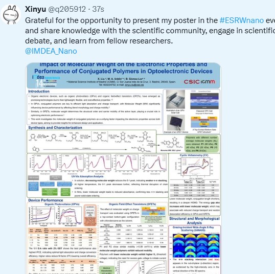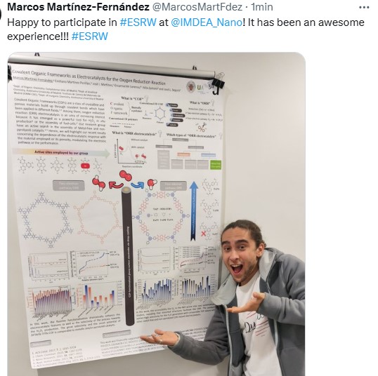 Please, tag IMDEA Nanociencia and the hashtag #ESRWnano in your post along with an image of your poster, photography, video or animated art of your research. Make sure your post is public and others can discover it. IMDEA Nanociencia will be reposting the communications in order for everyone to follow the discussion online. If you notice your post is not reposted, please write the committee at This email address is being protected from spambots. You need JavaScript enabled to view it.. The Best Social Media Communication will be decided by the scientific committee, according to the a) scientific content (50%), b) creativity (30%) and c) interactivity (replies, likes and impressions, 20%), and will be awarded with a prize during the closing session. ↓ Your #ESRWnano post will be reposted in this wall ↓